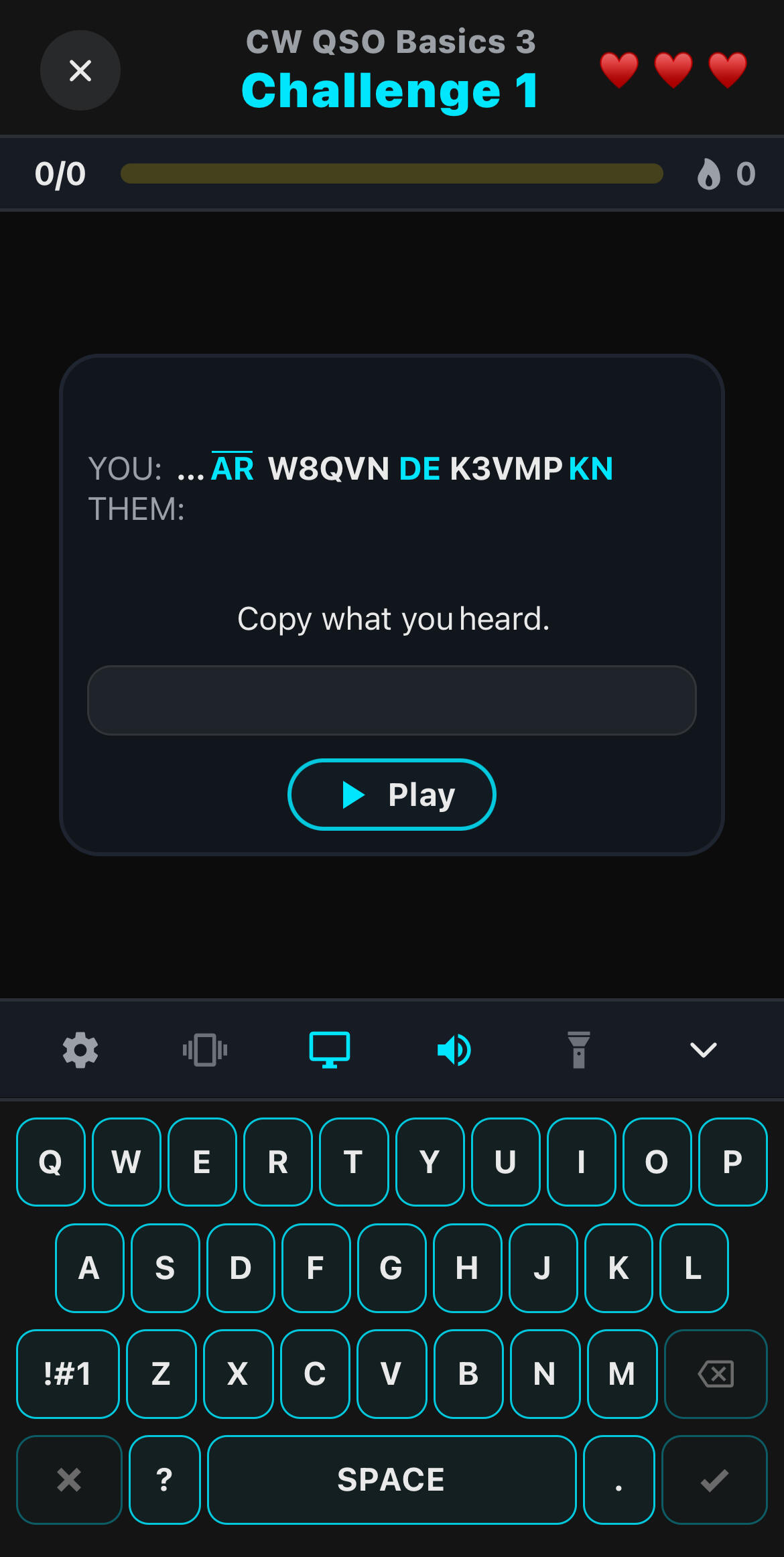 Learn common CW QSO exchange patterns with mixed receive/send practice and guided multiple-choice questions.